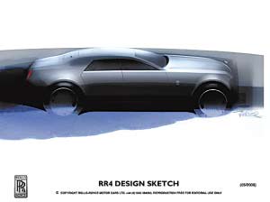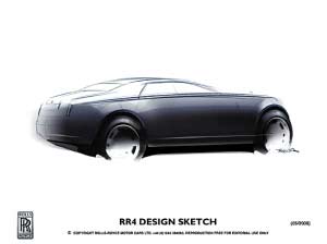 勞斯萊斯汽車有限公司日前公布了全新車型的首批設(shè)計草圖。作為勞斯萊斯家族的最新成員,此款代號為RR4的車型將于2010年正式發(fā)布。RR4將略小于幻影,并配備勞斯萊斯獨有的新型引擎。