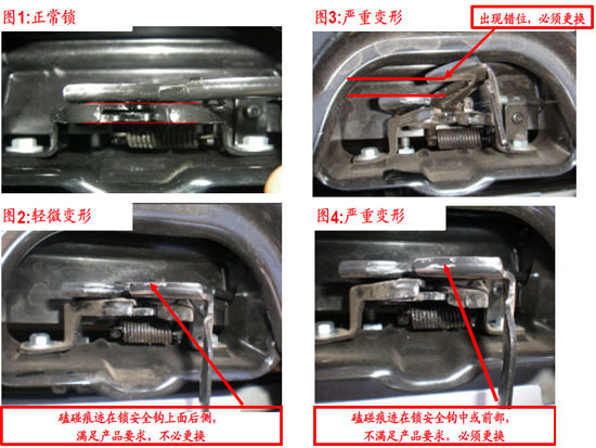 對于此問題,廠家采取維修的方法進行解決。對輕微變形的發(fā)動機艙蓋鎖下鎖體不用更換,對于嚴重變形的必須更換。對于發(fā)動機艙蓋鎖假鎖現(xiàn)象,需要檢查下鎖體,看鎖鉤與下鎖體導(dǎo)槽位置是否對正。如果偏移較大,調(diào)整鎖體螺栓對正。如果對正后仍然出現(xiàn)功能故障(假鎖)情況,需用挫刀打磨鎖鉤兩側(cè)表面約0.3mm,然后用細砂紙打磨拋光并檢查開啟功能。最后將打磨過的鎖銷噴漆,防止氧化。