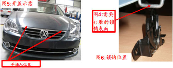 部分新寶來出現(xiàn)發(fā)動機艙蓋開啟困難的現(xiàn)象,用操縱手柄開啟發(fā)動機艙蓋,發(fā)動機艙蓋沒有解鎖彈起(發(fā)動機艙蓋不能正常開啟)。經(jīng)判定為發(fā)動機艙蓋鎖的質(zhì)量問題或裝配質(zhì)量問題,可能為下鎖體變形或者鎖鉤與下鎖體不對正,進而造成關(guān)閉開啟困難或假鎖。