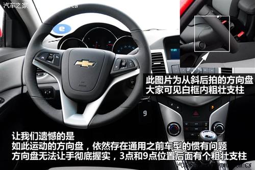 方向盤第一個不足還是老生常談:通用系列的方向盤在3點和9點位置后面都有粗壯的方向盤支柱,造成手無法完全握實,這個問題我我們從林蔭大道測試開始呼吁、到君越6AT、再到新君威、再到這次的科魯茲,天知道什么時候通用才明白方向盤3點9點的后面是該人手握的,是不能侵占的空間。