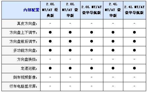 內(nèi)飾方面2.0L均配備織物座椅,而2.4L車型則采用真皮坐椅并且配備電加熱座椅,并且2.0L配備6向手動調(diào)節(jié)駕駛座椅,而2.4L配備8向電動調(diào)節(jié)并且代腰部支撐的駕駛座椅,不過副駕駛?cè)囅抵粯?biāo)配4向手動調(diào)節(jié)座椅,另外入門級車型只配備CD播放器,2.0L和2.4L豪華型采用6CD播放器,而2.0L和2.4L豪華導(dǎo)航型配備DVD播放器和6.5寸寬屏液晶顯示器;包括導(dǎo)航功能,全系標(biāo)配6喇叭揚聲器、多功能方向盤自動分區(qū)空調(diào)和后排足部出風(fēng)口。