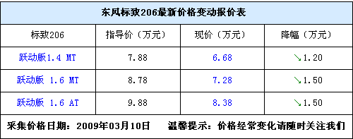 就在東風(fēng)標(biāo)致推出207車型的同時(shí),標(biāo)致206車型也隨之停產(chǎn)。近日,我們從北京地區(qū)的部分東風(fēng)標(biāo)致4S店處獲悉,現(xiàn)在標(biāo)致206正在清理庫存,優(yōu)惠較大,目前206僅有3款車型有現(xiàn)車,分別是躍動(dòng)版1.4手動(dòng),躍動(dòng)版1.6手動(dòng)和自動(dòng),現(xiàn)車最高優(yōu)惠1.5萬元元,售價(jià)分別為6.68萬,7.28萬和8.38萬元,現(xiàn)車比較充足,感興趣的朋友可以到店看車,價(jià)格還能有所降低。詳情請(qǐng)見下表。