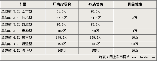 據(jù)奧迪4S店銷售人員介紹,目前銷售的奧迪Q7包括了3.6和4.2排量共7款車型。消費(fèi)者在購買的同時可以選擇個性化選裝配置,其中包括了座椅顏色,內(nèi)飾顏色,剎車盤,音響等一系列配置,據(jù)介紹,選擇個性化配置后,車價將有相應(yīng)增加。同時消費(fèi)者可以直接購買原車型,目前全車系3.6排量三款車優(yōu)惠3萬元現(xiàn)金,豪華版優(yōu)惠4萬。而4.2舒適型最低可優(yōu)惠到135萬,降幅達(dá)23萬。目前4S店現(xiàn)車主要以黑色為主,內(nèi)飾有灰色、米色可供選擇。