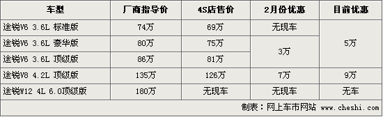 筆者從進(jìn)口大眾經(jīng)銷商處了解到,相比2月份途銳的優(yōu)惠幅度,目前優(yōu)惠有進(jìn)一步加大,其中途銳V6三款車優(yōu)惠現(xiàn)金5萬元,而途銳4.2L頂級版則優(yōu)惠9萬元現(xiàn)金,比上月優(yōu)惠幅度均增加2萬元。但據(jù)4S店銷售人員介紹,目前3.6標(biāo)準(zhǔn)版和6.0頂級版尚沒有現(xiàn)車,其他各款有黑色和銀色可選擇,但數(shù)量非常少。在內(nèi)飾顏色方面,途銳有米黃色、灰色、黑色和棕色四款可供選擇,而一般大眾顏色為米黃和灰色。近期,途銳將有部分新車到店,消費(fèi)者可到4S店看車試駕。