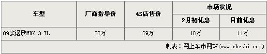 據(jù)謳歌經(jīng)銷商銷售人員介紹,謳歌08款MDX已經(jīng)停止進(jìn)口現(xiàn)車已賣完,以后也不會再引進(jìn)。目前在售的為謳歌09款MDX車型,09款謳歌-MDX的優(yōu)惠現(xiàn)已加大到11萬元,優(yōu)惠后售價(jià)也從原廠商售價(jià)80萬降到了69萬,跌破了70萬元。銷售人員還介紹,09款謳歌MDX增加的實(shí)用性的配件包括前下護(hù)板和后下護(hù)板,能避免惡劣路況對底盤帶來的損傷,并且09款謳歌MDX還新增了巴厘海藍(lán)和摩卡褐金兩種顏色,店內(nèi)現(xiàn)車非常充足,顏色也比較全,欲購買者挑選的空間非常大。