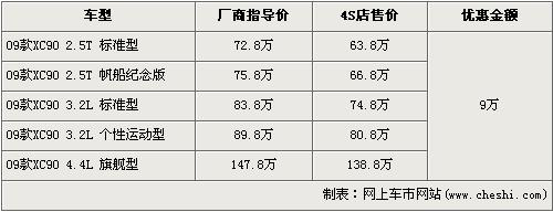 據(jù)沃爾沃經(jīng)銷商處銷售人員介紹,目前店內(nèi)的09款XC90車型全系都有9萬(wàn)元的現(xiàn)金優(yōu)惠,并且此次優(yōu)惠活動(dòng)截止到7月1日。經(jīng)優(yōu)惠后,2.5T標(biāo)準(zhǔn)型的售價(jià)跌破70萬(wàn)元,僅售63.8萬(wàn)元。2.5T 帆船紀(jì)念版經(jīng)9萬(wàn)元優(yōu)惠后,售價(jià)從75.8萬(wàn)元下降到了66.8萬(wàn)元。兩款3.2L排量車型經(jīng)優(yōu)惠后售價(jià)降為74.8萬(wàn)元及80.8萬(wàn)元,頂配的4.4L旗艦車型售價(jià)降為了138.8萬(wàn)元。銷售人員還介紹,XC90全系車型齊全,消費(fèi)者挑選的空間較大。