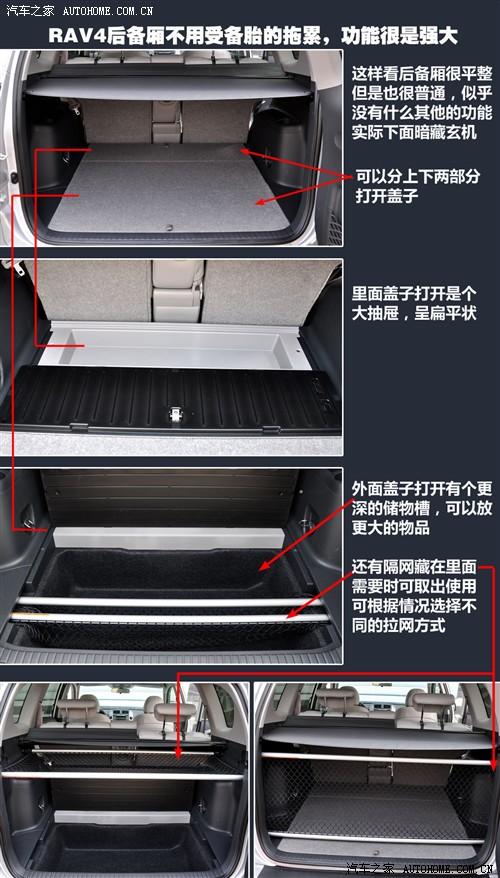 最強大的是RAV4的后備廂,首先側(cè)開的尾門本身就比較方便,只是針對關(guān)面我們提到過的車門鉸鏈強度問題后續(xù)還要進行關(guān)注。后備廂非常平坦,得益于備胎外掛的形式,儲物能力也非常強。地板可以分兩部分打開,靠里面的打開是類似一個抽屜的儲物格,靠外面的則是比較深的一個大儲物槽,同時還有隔離網(wǎng)袋可以取出來用,分兩種方式掛在廂壁上的掛鉤上,將后備廂分隔開來,方便固定物品。