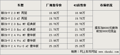 據(jù)4S店銷售人員介紹,目前消費(fèi)者購買新CR-V現(xiàn)車的話仍然需要在店內(nèi)做8000元的裝飾,或者加3000元現(xiàn)金,相比之前加價減少。目前現(xiàn)車方面主要有白色、銀色和黑色等款可供選擇。入門級手動檔車型目前沒有現(xiàn)車,預(yù)訂的話需要交訂金5000元,一個星期左右便可以順利提車。