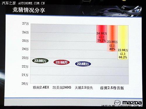 通過(guò)睿翼先推2.5L車型的并且老款車型不停產(chǎn)的策略使馬自達(dá)6的產(chǎn)品線將會(huì)有著十分強(qiáng)大的產(chǎn)品結(jié)構(gòu),目前市場(chǎng)上面馬自達(dá)6最低配車型的成交價(jià)(個(gè)別地區(qū))已經(jīng)跌破15萬(wàn)元,這對(duì)于一款合資中型車來(lái)說(shuō)有絕對(duì)的優(yōu)勢(shì),新上市的睿翼頂配車型售價(jià)為24.98萬(wàn)元,這使馬自達(dá)6的產(chǎn)品線跨越15-25萬(wàn)元的售價(jià)區(qū)間(雖然是新老車型的區(qū)別,對(duì)于廠商來(lái)說(shuō)畢竟都是馬自達(dá)6系列的產(chǎn)品,畢竟對(duì)于商家無(wú)論黑貓白貓能抓耗子的就是好貓)。