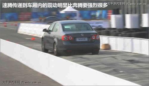 濕滑路面體驗(yàn)這個(gè)項(xiàng)目主要是模擬冰雪路面的對(duì)于車輛的操控,在光滑的鋼板上潑上水附著力減小,在通過(guò)彎道時(shí)速騰依舊過(guò)早的出現(xiàn)轉(zhuǎn)向不足的情況,不過(guò)方向盤的指向依舊保持的較為精準(zhǔn)。奔騰在高速過(guò)彎時(shí)側(cè)傾要小于速騰,不過(guò)路感不是特別清晰,電子穩(wěn)定系統(tǒng)起到的作用非常明顯,底盤在舒適性和運(yùn)動(dòng)性間找到了平衡點(diǎn)。