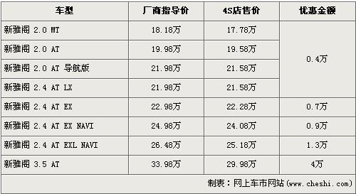 據(jù)4S店銷(xiāo)售人員介紹,目前新雅閣全系優(yōu)惠最高達(dá)到了4萬(wàn)元。新雅閣分為2.0、2.4、3.5三個(gè)排量,全系最低配的2.0手動(dòng)版經(jīng)4000元優(yōu)惠后售價(jià)降到了17.78萬(wàn)元,2.4L車(chē)型高配的EXL NAVI版經(jīng)1.3萬(wàn)元優(yōu)惠后售價(jià)降到了25.18萬(wàn)元,而3.5排量車(chē)型優(yōu)惠4萬(wàn)元達(dá)到了全系的最高。銷(xiāo)售人員還介紹,除了最低配的車(chē)型無(wú)現(xiàn)車(chē)外,其他車(chē)型均有現(xiàn)車(chē)。