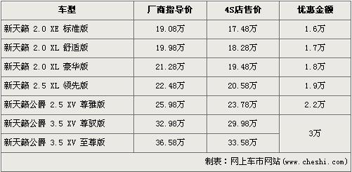 根據(jù)4s店銷(xiāo)售人員介紹,近期購(gòu)買(mǎi)新天籟的消費(fèi)者可以享受到全系最高3萬(wàn)元的優(yōu)惠。新天籟車(chē)型分為2.0、2.5以及3.5三個(gè)排量,3.5L車(chē)型目前讓利3萬(wàn)元達(dá)到了全系的最高,經(jīng)優(yōu)惠后3.5 尊馭版和3.5至尊版售價(jià)分別降到了29.98萬(wàn)元和33.58萬(wàn)元。而其他兩個(gè)排量車(chē)型則采用的是買(mǎi)車(chē)購(gòu)置稅減半的優(yōu)惠政策,根據(jù)消費(fèi)者要求的不同,減去的一半購(gòu)置稅也可以抵車(chē)價(jià)。全系入門(mén)級(jí)的2.0標(biāo)準(zhǔn)版經(jīng)優(yōu)惠后,售價(jià)跌破18萬(wàn)元,僅為17.48萬(wàn)元。優(yōu)惠銷(xiāo)售人員還介紹,新天籟全系均無(wú)現(xiàn)車(chē),欲購(gòu)買(mǎi)車(chē)需交訂金1萬(wàn)元,約等1個(gè)月可提車(chē)。