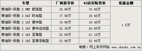 據(jù)4S店銷(xiāo)售人員介紹,目前消費(fèi)者購(gòu)買(mǎi)蒙迪歐致勝全系可以?xún)?yōu)惠現(xiàn)金1.5萬(wàn)元,同時(shí)個(gè)別款色還需要先預(yù)定。入門(mén)車(chē)型在優(yōu)惠后售價(jià)僅為15.48萬(wàn)元,不足16萬(wàn),但目前手動(dòng)檔車(chē)型4S店內(nèi)暫時(shí)沒(méi)有現(xiàn)車(chē),需要消費(fèi)者先行預(yù)定,F(xiàn)車(chē)方面,有黑色,銀色等可供選擇,內(nèi)飾有淺色和深色兩種可選。