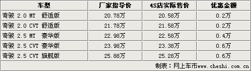 東風日產(chǎn)奇駿自去年11月上市以來一直備受消費者關注。國產(chǎn)后的奇駿填補了東風日產(chǎn)在SUV領域的空白,為那些對越野性有更多需求的城市SUV消費者提供了更多的選擇機會。根據(jù)網(wǎng)上車市價格監(jiān)測系統(tǒng)顯示,奇駿現(xiàn)車供應仍然比較緊張,但較前一陣有所緩解,全系車型均出現(xiàn)了價格浮動。2.5頂配和豪華自動檔車型的優(yōu)惠幅度均已達到了6000元。
