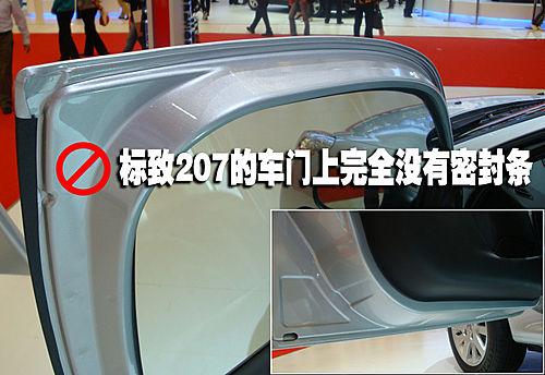 標(biāo)致207在車門一側(cè)完全沒有設(shè)計密封條,在其車門上也沒有任何可以固定密封條的固定點。不過在車身一側(cè)門框的位置設(shè)計了兩道密封,不過盡管是這樣標(biāo)致207依然是這項對比中最差的一個。