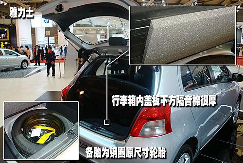 我們看到豐田雅力士的行李箱與備胎之間的蓋板上設(shè)計了非常厚的一層隔音材料,并且備胎兩側(cè)的工具箱都是做工非常精良的塑料材質(zhì)整體上看非常整齊美觀。