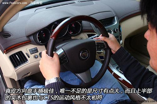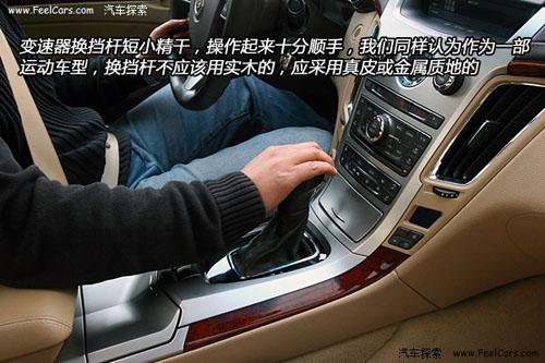 接著轉(zhuǎn)向車內(nèi)看看,真皮方向盤手感極佳,唯一不足的是尺寸有點(diǎn)大,而且上半部的實(shí)木包裹也與CTS的運(yùn)動風(fēng)格不太相符。變速器換擋桿短小精干,操作起來十分順手,不過我們同樣認(rèn)為作為一部運(yùn)動車型,換擋桿不應(yīng)該用實(shí)木的,而應(yīng)該用皮質(zhì)或金屬的。