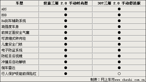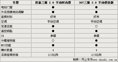 由于兩款車型都是2.0的低配車型,所以在配置方面沒有太突出的地方。電動門窗、外后鏡電動調(diào)節(jié)、遙控鑰匙和后排座椅放倒功能都是它們的標配。但是兩款車型還是各自都有各自的特點,雪鐵龍世嘉三廂配備了定速巡航,可以大大減少駕駛員長途駕駛的疲勞。標致307則配備了具有冷藏儲物功能的手套箱。這些配置在同級別同價位的車型中都是很少見到的。