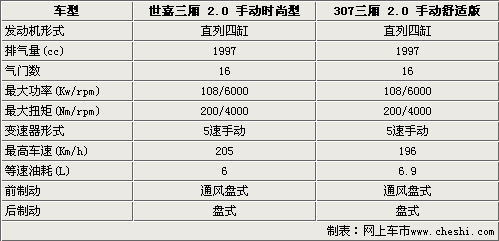 東風(fēng)雪鐵龍世嘉三廂和標致307動力系統(tǒng)相同,都是2.0升直列4缸發(fā)動機并且同時運用了電子節(jié)氣門技術(shù),該技術(shù)可以能根據(jù)駕駛員的需求愿望以及整車各種行駛狀況確定節(jié)氣門的最佳開度,保證車輛最佳的動力性和燃油經(jīng)濟性。兩款車型的動力輸出完全一樣,但是由于各自的整備質(zhì)量和設(shè)計不同,所以在最高時速和油耗上有所區(qū)別。兩款車型的變速系統(tǒng)均是5速手動變速箱。制動方式兩款車型均為前通風(fēng)盤式后實心盤式的剎車。