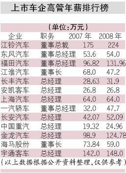 一般而言,年度薪酬是和整個(gè)行業(yè)效益成正比的,但從附表所列的情況來(lái)看,除了江淮汽車(chē)和海馬股份的董事長(zhǎng)因?yàn)槿ツ陿I(yè)績(jī)下滑厲害而自降薪酬外,其余車(chē)企掌門(mén)人的薪酬與2007年相比基本是穩(wěn)中有漲,其中上海汽車(chē)與安凱客車(chē)則是與2007年持平,江鈴汽車(chē)、福田汽車(chē)和金龍汽車(chē)的掌門(mén)人2008年的薪酬同比2007年增長(zhǎng)了三成左右,都在100萬(wàn)元以上,足以讓乘用車(chē)企負(fù)責(zé)人“眼紅”。上海汽車(chē)、長(zhǎng)安汽車(chē)和一汽轎車(chē)這些規(guī)模龐大的乘用車(chē)的一把手的薪酬也不過(guò)65萬(wàn)元。