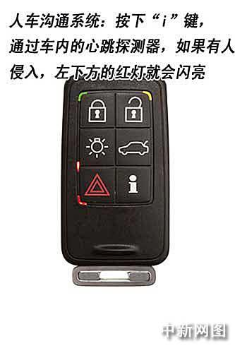 人車溝通系統(tǒng)(PCC)是沃爾沃汽車公司所獨(dú)的,將PCC隨身攜帶,在您到達(dá)車邊時汽車將自動開鎖。按下儀表盤上的按鈕即可啟動發(fā)動機(jī)。按下信息按鈕,就可以知道車門鎖閉狀態(tài)以及車內(nèi)的各個系統(tǒng)是否正常關(guān)閉。一個很特殊的設(shè)置是,根據(jù)沃爾沃工作人員的演示,按下“i”鍵,就可以通過安裝在車內(nèi)的心跳探測器知道車內(nèi)是否有人,防止乘客被誤鎖或車輛被非法侵入的情況。(陳鑫)