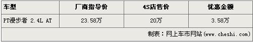 據(jù)北京克萊斯勒經(jīng)銷店銷售人員介紹,近期購(gòu)買(mǎi)PT漫步者的消費(fèi)者可以得到3.58萬(wàn)元的優(yōu)惠。在售的PT漫步者為2.4L自動(dòng)檔車(chē)型,售價(jià)為23.58萬(wàn)元。經(jīng)優(yōu)惠后,PT漫步者的售價(jià)從23.58萬(wàn)元下降到了20萬(wàn)元。銷售人員還說(shuō),店內(nèi)現(xiàn)車(chē)顏色主要是黑色和銀色,欲購(gòu)買(mǎi)其他顏色的消費(fèi)者需交定金1萬(wàn)元,最快下周就可提車(chē)。
