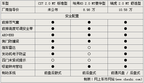 在安全配置,三款車(chē)都標(biāo)配前排雙氣囊、ABS+EBD、側(cè)門(mén)防撞梁等安全裝備,但瑞虎的配置無(wú)疑是最全的,但售價(jià)要比哈弗H3貴近1.6萬(wàn)元,而獵豹cs7的售價(jià)還未公布。倒車(chē)?yán)走_(dá)、電子防盜等都為CS7標(biāo)配,但前盤(pán)后鼓的剎車(chē)設(shè)計(jì)讓人有些失望。