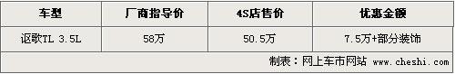 據(jù)4S店銷售人員介紹,目前謳歌TL現(xiàn)車最高可優(yōu)惠到50.5萬(wàn)元,而原來(lái)廠商指導(dǎo)價(jià)格為58萬(wàn)元,直降幅度達(dá)到了7.5萬(wàn)元,同時(shí)部分店內(nèi)還將贈(zèng)送一部分車內(nèi)裝飾。目前現(xiàn)車供應(yīng)比較充足,主要有黑色、銀色、灰色、紅色等。欲購(gòu)車的消費(fèi)者可以到店試乘試駕這款車。