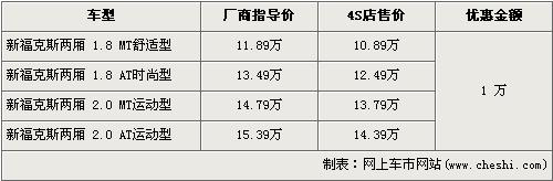 據(jù)長安福特經(jīng)銷商處銷售人員介紹,兩廂新款?怂谷祪(yōu)惠1萬元。兩廂新款?怂狗譃1.8L和2.0L兩種排量,入門級車型的1.8L手動舒適版經(jīng)優(yōu)惠后,售價(jià)為10.89萬元。高配的2.0L自動運(yùn)動版售價(jià)降到了14.39萬元。