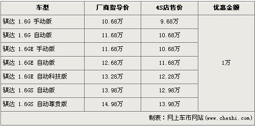 據(jù)東風(fēng)日產(chǎn)4s店銷售人員介紹,目前東風(fēng)日產(chǎn)騏達(dá)全系優(yōu)惠1萬元。經(jīng)優(yōu)惠優(yōu)惠后,入門級的1.6G手動版售價(jià)下降到了9.68萬元,而全系最高配的1.6 GS自動尊貴版售價(jià)也降到了13.98萬元,跌破了14萬元。銷售人員還介紹,目前店內(nèi)沒有騏達(dá)現(xiàn)車,欲購買者需交2000元訂金約等兩個(gè)月時(shí)間。