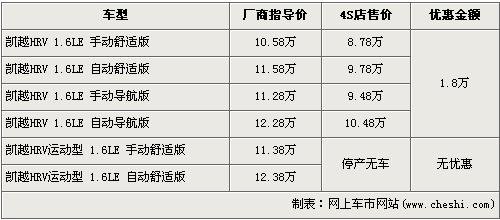 據(jù)經(jīng)銷商處銷售人員介紹,凱越HRV共有6個(gè)車型,由于運(yùn)動版車型現(xiàn)已停產(chǎn),經(jīng)銷店內(nèi)已經(jīng)沒有現(xiàn)車,所以在售的車型只有舒適版和導(dǎo)航版共4款車型。近期購買凱越HRV的消費(fèi)者可以得到1.8萬元的現(xiàn)金優(yōu)惠,經(jīng)優(yōu)惠后,入門級的1.6LE 手動舒適版車型售價(jià)從廠商指導(dǎo)價(jià)10.58萬元跌至8.78萬元。