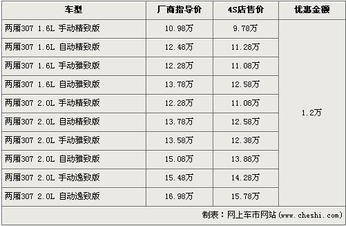 據(jù)東風(fēng)標(biāo)致經(jīng)銷店銷售人員介紹,兩廂標(biāo)致307分為1.6L和2.0L兩種排量,目前優(yōu)惠1.2萬元,入門車型的1.6L 手動精致版原廠商指導(dǎo)價(jià)為10.98萬元,經(jīng)優(yōu)惠后僅售9.78萬元,排量稍大的2.0L排量的低配車型手動精致版經(jīng)優(yōu)惠后售價(jià)為11.08萬元,F(xiàn)車方面,1.6L車型現(xiàn)車充足,2.0L車型則現(xiàn)車緊張,挑選空間不大。