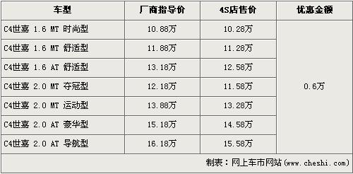 據(jù)經(jīng)銷商處銷售人員介紹,C4世嘉全系優(yōu)惠金額6000元。目前,C4世嘉全系最低配的1.6L手動時(shí)尚型售價(jià)從原廠商指導(dǎo)價(jià)10.88萬元降至10.28萬元,黑內(nèi)飾的2.0L手動運(yùn)動型售價(jià)也降至到了13.28萬元。銷售人員還介紹,目前店內(nèi)現(xiàn)車以銀色、紅色為主。