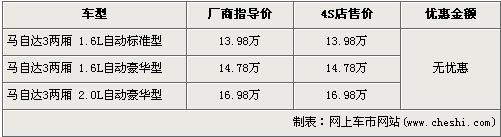 據(jù)經(jīng)銷商處銷售人員介紹:目前店內(nèi)僅馬自達(dá)3兩廂1.6L車型有少量現(xiàn)車,顏色以紅和黑為主。2.0L車型已沒有現(xiàn)車,但4S店接受預(yù)定,不過提車時(shí)間不能確定。