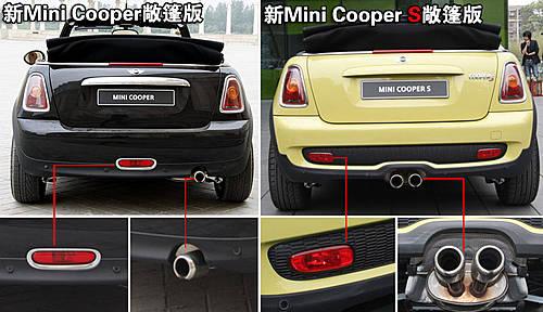 在車輛尾部,新一代Mini Cooper和Mini Cooper S敞篷版的差異也顯而易見。新一代Mini Cooper敞篷版的保險杠單霧燈和左側單排氣管設計,均被新一代Mini Cooper S敞篷版上的保險杠雙霧燈和中置雙排氣管所替代,而尾部“Cooper S”的LOGO就更不用說了。