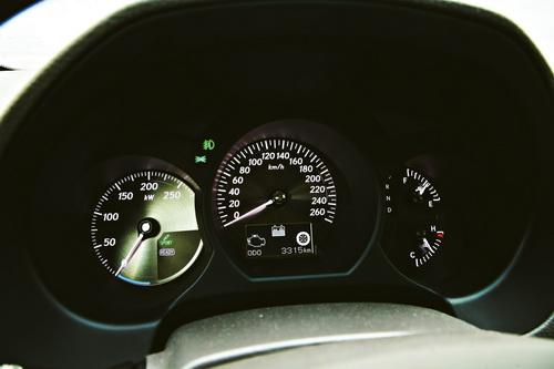 由于使用了電動機系統(tǒng),GS450h的儀表盤并沒有設置發(fā)動機轉速表,取而代之的一個功率表,隨時顯示電動機的瞬時輸出功率;至于中間的車速表和右邊的綜合信息表在所有車型上則都是一樣的。GS系列車型儀表盤另一個特點就是具有ECD電子色控裝置,能夠根據照射在儀表盤上的光線強度自動調節(jié)自身亮度,保證駕駛員能夠清晰地讀取數據——安全實用的配置。