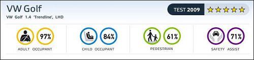 綜合來(lái)看,高爾夫6代獲歐洲碰撞測(cè)試實(shí)驗(yàn)室5星評(píng)價(jià)。對(duì)成員保護(hù)得分率97%,對(duì)兒童保護(hù)得分率84%,對(duì)行人保護(hù)得分率61%,安全輔助裝備得分率71%。