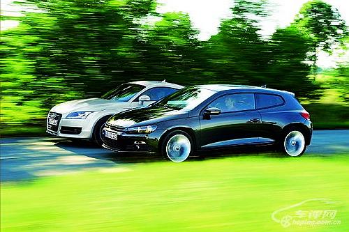 當(dāng)“尚酷”吹來時(shí),情況變了。這是一位血緣相同的異姓兄弟,同樣來自PQ35平臺,同樣是轎跑車,一身平民裝束讓它看起來就像是一位起義領(lǐng)袖。雖然它登臺的目的不是要窩里反,可是這無疑給了我們這些成天琢磨汽車的好事者一個(gè)制造“爭端”的機(jī)會。于是TT 1.8TFSI和尚酷1.4TSI就被強(qiáng)迫上了擂臺。