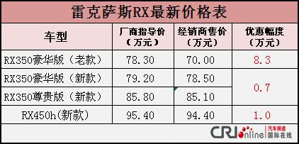 新款RX350分別為豪華版和尊貴版兩款車型,近期購買RX350新款的消費者可以得到7000元的優(yōu)惠。銷售人員還介紹,剛剛上市的RX450h車型貨源相對比較緊張,所以只有1萬元的優(yōu)惠,而且目前還有老款RX350的庫存車,優(yōu)惠幅度較大,達(dá)到了8.3萬元,售價達(dá)到70萬元。詳細(xì)優(yōu)惠信息如下: