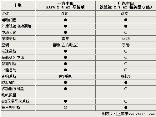 一汽豐田RAV4 2.4自動(dòng)導(dǎo)航版和廣汽豐田漢蘭達(dá)2.7精英型7座的舒適配置相差比較懸殊。RAV4 2.4自動(dòng)導(dǎo)航版屬于RAV4車系中的頂配車型,舒適配置可謂是應(yīng)有盡有,電動(dòng)天窗、真皮座椅、自動(dòng)空調(diào)、定速巡航、多功能方向盤、DVD影音系統(tǒng)等設(shè)備都成為了標(biāo)準(zhǔn)配置。而漢蘭達(dá)2.7精英型7座屬于該車系中的低配車型,在舒適配置方面盡顯于基本使用。但在空間利用上漢蘭達(dá)還是比較具有優(yōu)勢(shì)的,首先漢蘭達(dá)最多可以承載7名乘客,而且室內(nèi)空間可以靈活多變,放倒比例達(dá)到了4:2:4,可以更加有效的方便乘客置放大件物品。
