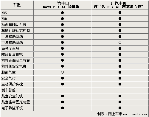從上表我們可以看到,在電子主動(dòng)安全系統(tǒng)的配備中,ABS+EBD、動(dòng)態(tài)穩(wěn)定系統(tǒng)和6安全氣囊均成為了一汽豐田RAV4 2.4自動(dòng)導(dǎo)航版和廣汽豐田漢蘭達(dá)2.7精英型7座的標(biāo)準(zhǔn)配置。但仔細(xì)看下來(lái)它們還是略有不同。豐田RAV4再配備了上坡輔助系統(tǒng)的同時(shí),還配備下坡輔助系統(tǒng),確保車輛在斜坡上能以穩(wěn)定速度的行駛。而漢蘭達(dá)則是配備了膝部氣囊,可以有效的降低事故發(fā)生后對(duì)乘客的傷害。比較遺憾的是這兩款車型均沒(méi)有配備倒車輔助系統(tǒng)。