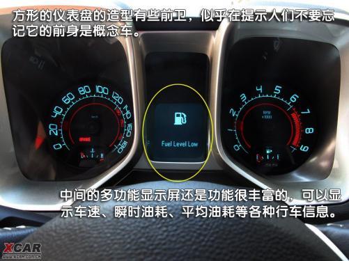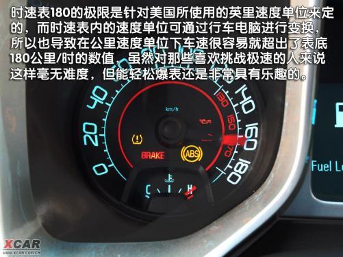 方形的儀表盤的造型有些前衛(wèi),似乎在提示人們不要忘記它的前身是概念車。中間的多功能顯示屏還是功能很豐富的,可以顯示車速、瞬時(shí)油耗、平均油耗等各種行車信息。在右側(cè)紅區(qū)表底9000轉(zhuǎn)的轉(zhuǎn)速表內(nèi),可以看到SS的小logo。左邊的時(shí)速表實(shí)在有些不夠讓人心動,為什么這么說呢,因?yàn)闀r(shí)速表的表底數(shù)值為180,難道Camaro SS這么強(qiáng)大超級跑車最高時(shí)速只能達(dá)到180公里/時(shí),不是之前官方說288公里/時(shí)嗎?據(jù)工作人員介紹,180的極限數(shù)值是針對美國所使用的英里速度單位來定的,而時(shí)速表內(nèi)的速度單位可通過行車電腦進(jìn)行變換,所以也導(dǎo)致Camaro SS在公里/時(shí)的速度單位下,很容易就超出表底180的最高車速,雖然對于那些喜歡挑戰(zhàn)極速的人來說180公里/時(shí)實(shí)在是毫無難度,但能夠如此輕松爆表還是非常具有樂趣的。
