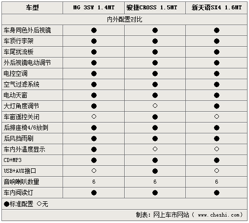 為了令駕乘者得到更多的便利,三車均在內(nèi)外設(shè)計了多項豐富便利的配置,在車輛外部的設(shè)計方面三車均有自己的特點,在保證了高性能的前提下,多項豪華配置均出現(xiàn)在三款跨界車型之上,內(nèi)部的多項設(shè)計對乘員的舒適及娛樂需要兩者也都考慮的相當(dāng)周全,帶MP3的CD播放器以及自動空調(diào)等一應(yīng)俱全。