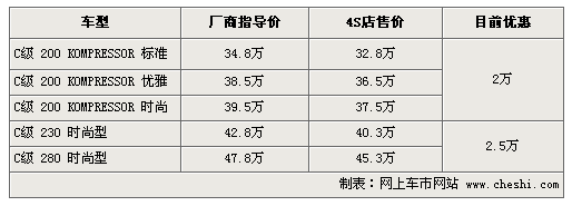 據(jù)4S店銷售人員介紹:目前奔馳C優(yōu)惠幅度較大,全系購車送全險,同時C200K優(yōu)惠達2萬元,C230、C280優(yōu)惠更是達到2.5萬元。不過目前現(xiàn)車較少,有些車型需要預(yù)訂,預(yù)定周期為1個月左右。C200K優(yōu)雅型與C230時尚型現(xiàn)車較少,C230時尚型甚至將要停產(chǎn),由于這兩款車價格與其它3款車型價格相近,并配置有些令人不滿,所以將要停止生產(chǎn)。