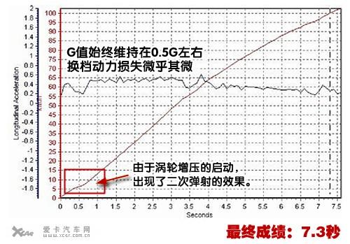 而加速過程中車頭也僅僅是微微上揚(yáng),良好的懸掛支撐,使車輛重心的后移并沒有對加速造成太大的麻煩。從曲線圖中我們還可以看出,除了加速初段渦輪扭力的爆發(fā),整個(gè)G值曲線均沒有較大起伏,始終維持在0.5G左右,換檔動(dòng)力損失微乎其微,最后加速成績也定格在7.3秒!比官方公布的8.3秒快了整整1秒!