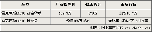 筆者目前從雷克薩斯經(jīng)銷商處了解,雷克薩斯LX570因產(chǎn)能有限,貨源供應(yīng)非常緊張。目前基本是訂單式銷售,而提現(xiàn)車的話加價(jià)金額則超過了10萬(wàn)元。同時(shí),雷克薩斯LX570增配版車型將于8月份到店,銷售人員介紹,增配版車型將增加智能副駕系統(tǒng),同時(shí)在內(nèi)飾和外觀上也有小幅的變化,預(yù)計(jì)售價(jià)在165萬(wàn)左右。具體售價(jià)目前尚未公布,現(xiàn)在消費(fèi)者訂車需要2萬(wàn)元定金,一個(gè)月左右方可提車。
