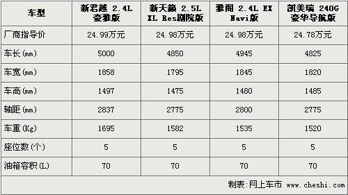 提到中級車市場,人們便會很快的想到新雅閣、新凱美瑞和新天籟這三款日系車型,它們在中級車市場里算是鼎鼎有名的“三位”了。隨著今年7月8日別克繼新君威后的又一力作新一代君越的正式上市,中級車市場迎來了又一款“重量級”車型。新君越的上市更加鞏固了別克在中級車市場的位置,并且給同級別的中級車帶來了更強的競爭力。既然有新車型加入了隊列,那么同級車之間價格和配置的“競爭戰(zhàn)”是必不可少的。下面我們就為您挑選了新君越2.4L豪雅型、新天籟2.5L XL RES劇院版、雅閣2.4L EX導(dǎo)航版和凱美瑞240G 豪華導(dǎo)航版四款價格相近的中級車作為比較,看看這四款熱門車?yán),哪款車型更適合將要購入中級車的您。