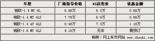 據(jù)4S店銷售人員介紹,目前銳歐全系優(yōu)惠幅度并不大,現(xiàn)售主要是1.4L排量車型,由于賽拉圖兩廂和三廂完全能夠滿足消費(fèi)者的購車需要,所以幾乎沒有消費(fèi)者選購1.6L排量的銳歐。1.4L三款車優(yōu)惠價格從0.68萬元到1.18萬元不等,同時店內(nèi)有銀色、紅色等現(xiàn)車可供選購,現(xiàn)車顏色較為齊全,消費(fèi)者選擇的空間比較大。