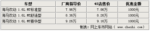 經(jīng)銷(xiāo)商表示,海馬歡動(dòng)1.8L排量車(chē)型,最低配的手動(dòng)舒適型售價(jià)8.76萬(wàn),最高配的自動(dòng)(CVT)豪華型售價(jià)10.66萬(wàn),優(yōu)惠金額均為9千元,除現(xiàn)金優(yōu)惠外還會(huì)有相應(yīng)的裝飾贈(zèng)送。現(xiàn)金優(yōu)惠配合購(gòu)置稅優(yōu)惠,則大大減輕了消費(fèi)者的購(gòu)車(chē)負(fù)擔(dān)。
