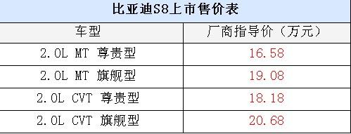 2009年7月19日,比亞迪旗下首款雙門硬頂跑車S8正式上市。新車共推出2.0L排量的四款車型,售價16.58-20.68萬元。此次為S8在深圳的首站上市,隨后S8還將陸續(xù)在國內(nèi)多個城市上市。新車詳細(xì)售價請見下表: